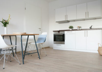 In den neuen Dachgeschosswohnungen können sich die Bewohner auf hochwertige Bäder, großzügige Balkone und moderne Hummel Küchen mit Marken Küchenelektrogeräten freuen. Auch eine Fußbodenheizung sorgt für behagliche Wärme und ein angenehmes Wohngefühl.